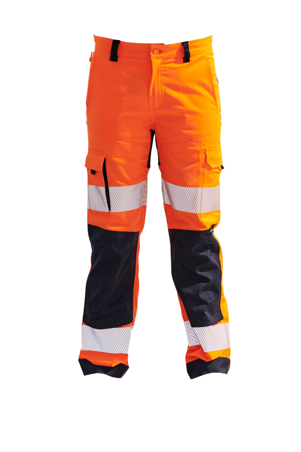 Poches genoux EN14404 en Cordura®, bas de jambe renforcé et bande rétro segmentée pour sécurité et durabilité. Entrejambe 82 cm + ourlet 5 cm.