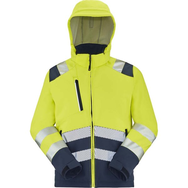 Softshell haute visibilité avec col montant et capuche amovible, fermeture zippée sous double rabat et poches étanches pour un rangement sécurisé.