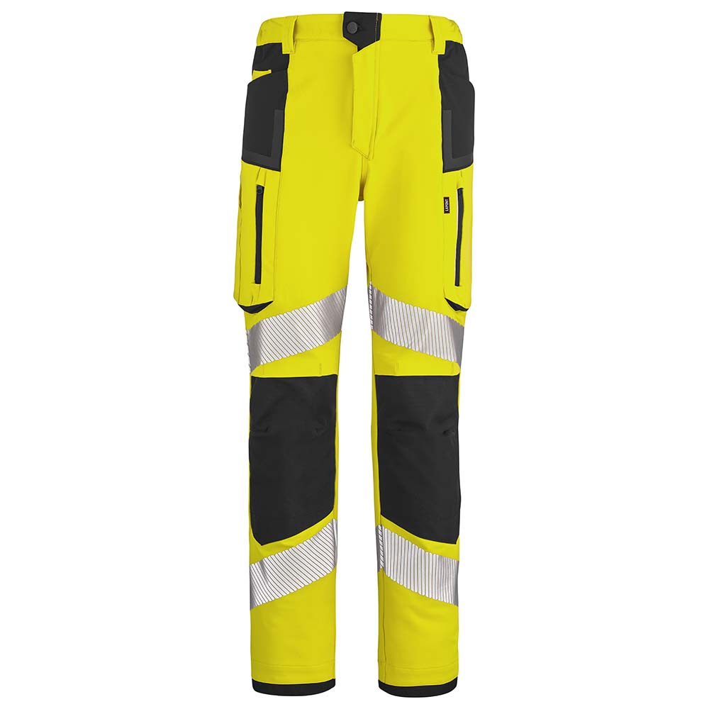 Pantalon de travail haute visibilité avec ceinture élastiquée côtés pour un confort optimal et bandes rétro-réfléchissantes 70 mm thermocollées pour une sécurité renforcée.