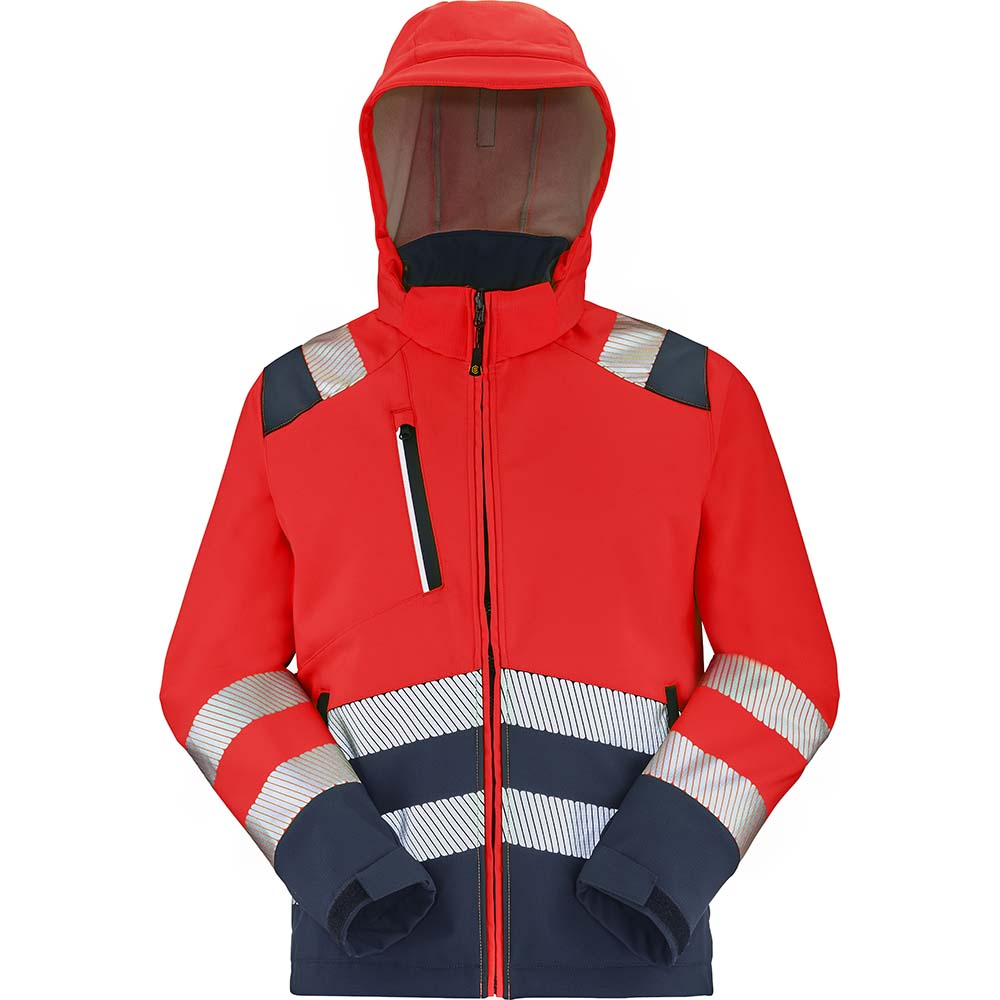 Softshell haute visibilité avec col montant et capuche amovible, fermeture zippée sous double rabat et poches étanches pour un rangement sécurisé.