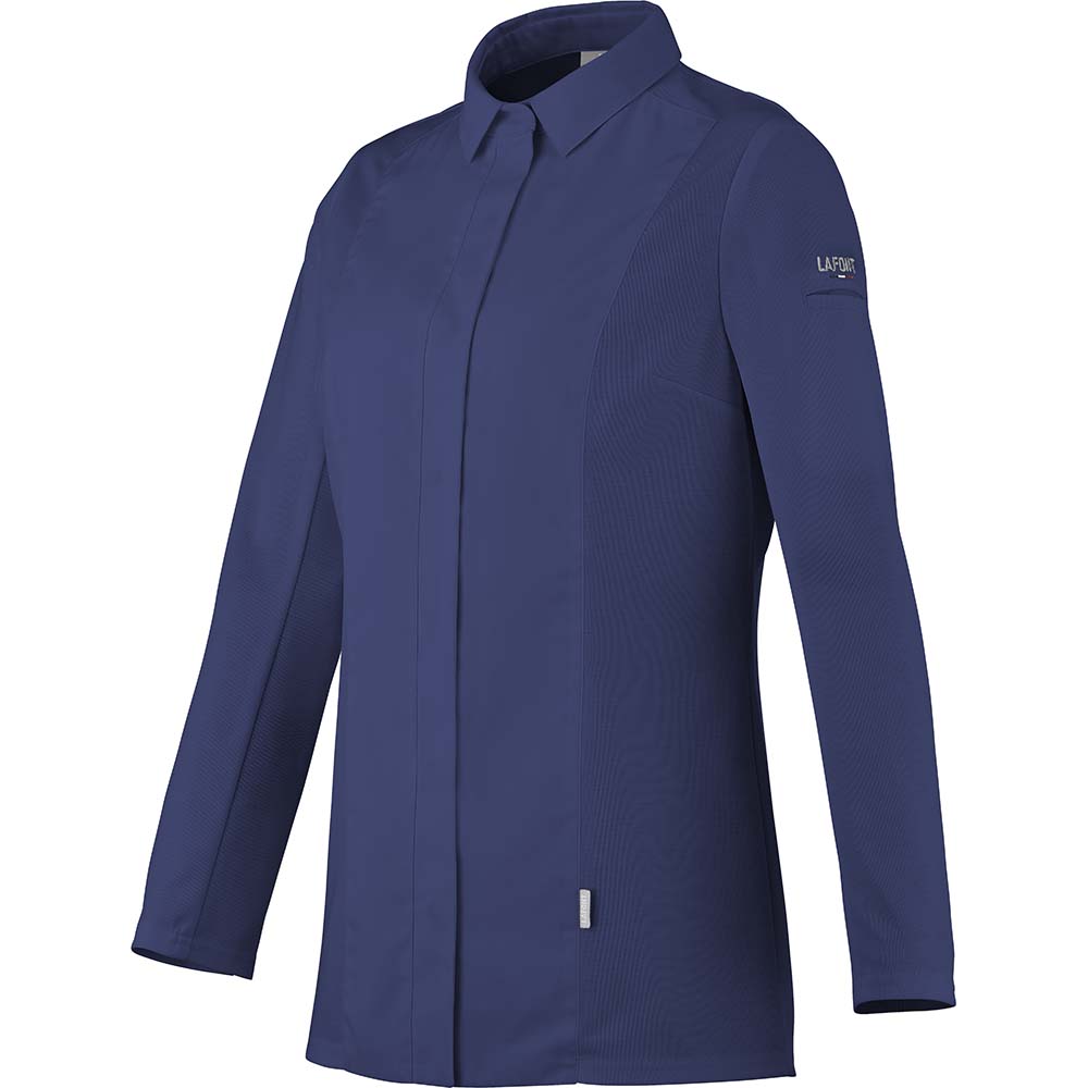 Veste professionnelle femme à col chemise avec plastron en sergé et fermeture par pressions cachées.